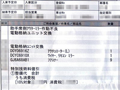 この前、ディーラーで不具合の確認をしてもらい、部品が揃う日に修理の予約を。修理時間は約1時間!?
