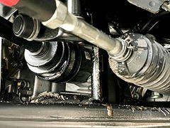 恐る恐る愛車の下回りを確認すると、フロント助手席側のドライブシャフト周辺にグリス飛散してる(-_-;)