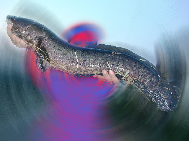 夜が明けて少ししてから目的の地域に到着、すぐさまI君の待つフィールドに向かった。そこにはI君と、対岸に一人の雷魚マンが既に釣りをしている。少しばかりI君と話した後、すぐに釣りを開始しました。タマに大型の捕食もあり、テンションは上がるのですが一向にアタックが無い。そうこうしていると、I君と喋っているときにアタックがあった模様、リールを巻いていると何か変??? 気が付いたときには、フロッグを雷魚が咥えて走っていたみたいです(^_^;)